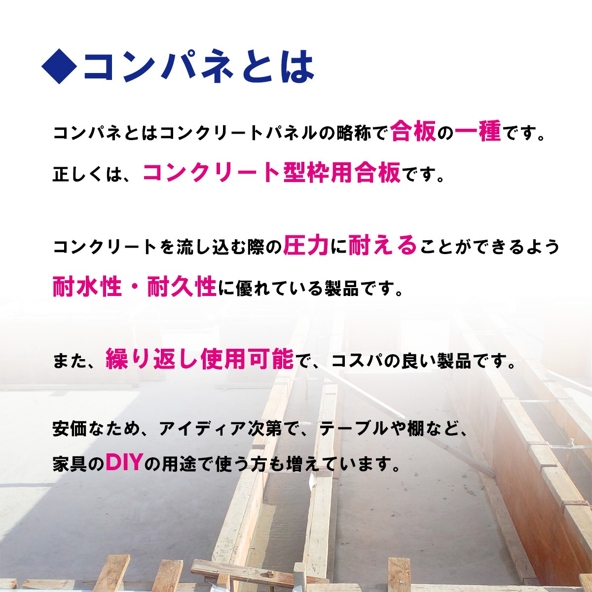コンパネとはコンクリートパネルの略称で合板の一種で、正しくは、コンクリート型枠用合板です。