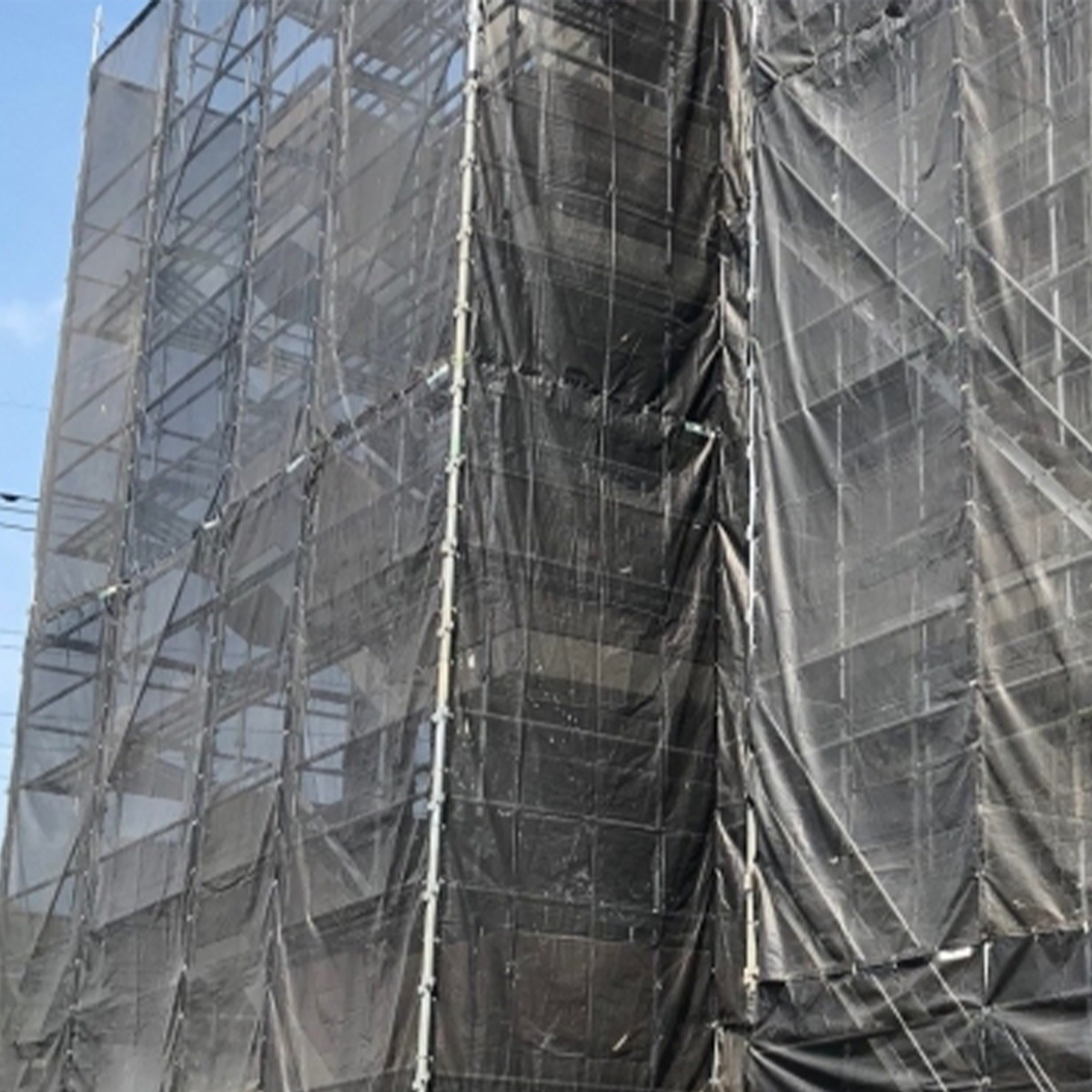 ■ メッシュシートは、主に建築工事現場で足場等の仮設構造物の外側構面に設け、飛来落下物が建築工事現場の外側へ飛び出すことを防止するために使用します。